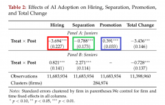 第一,代表初级员工的红色数据点则全正在0值以下(聘请缩减)。代表资深员工的蓝色数据点均正在0值及以上(需求未减以至添加),红色线代表初级员...
